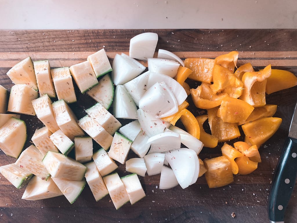 Once done soaking, place veggies and chicken on kabobs in whichever order you prefer