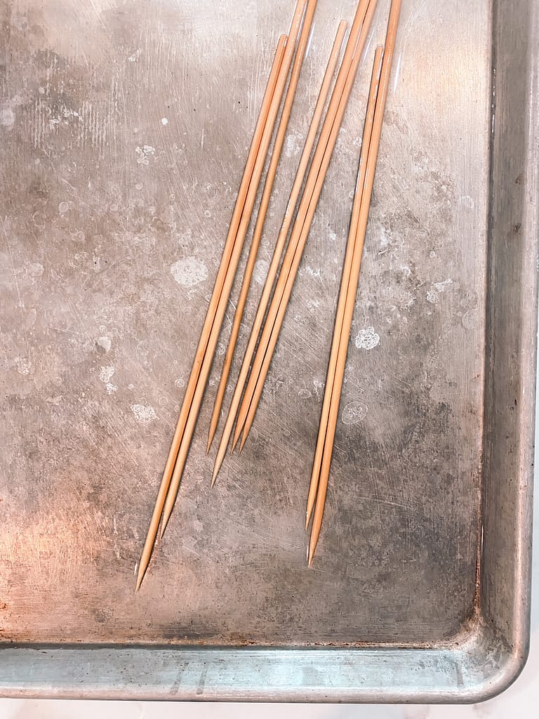 Before anything else, soak your bamboo skewers in a pan of water for 30 minutes to prevent burning.