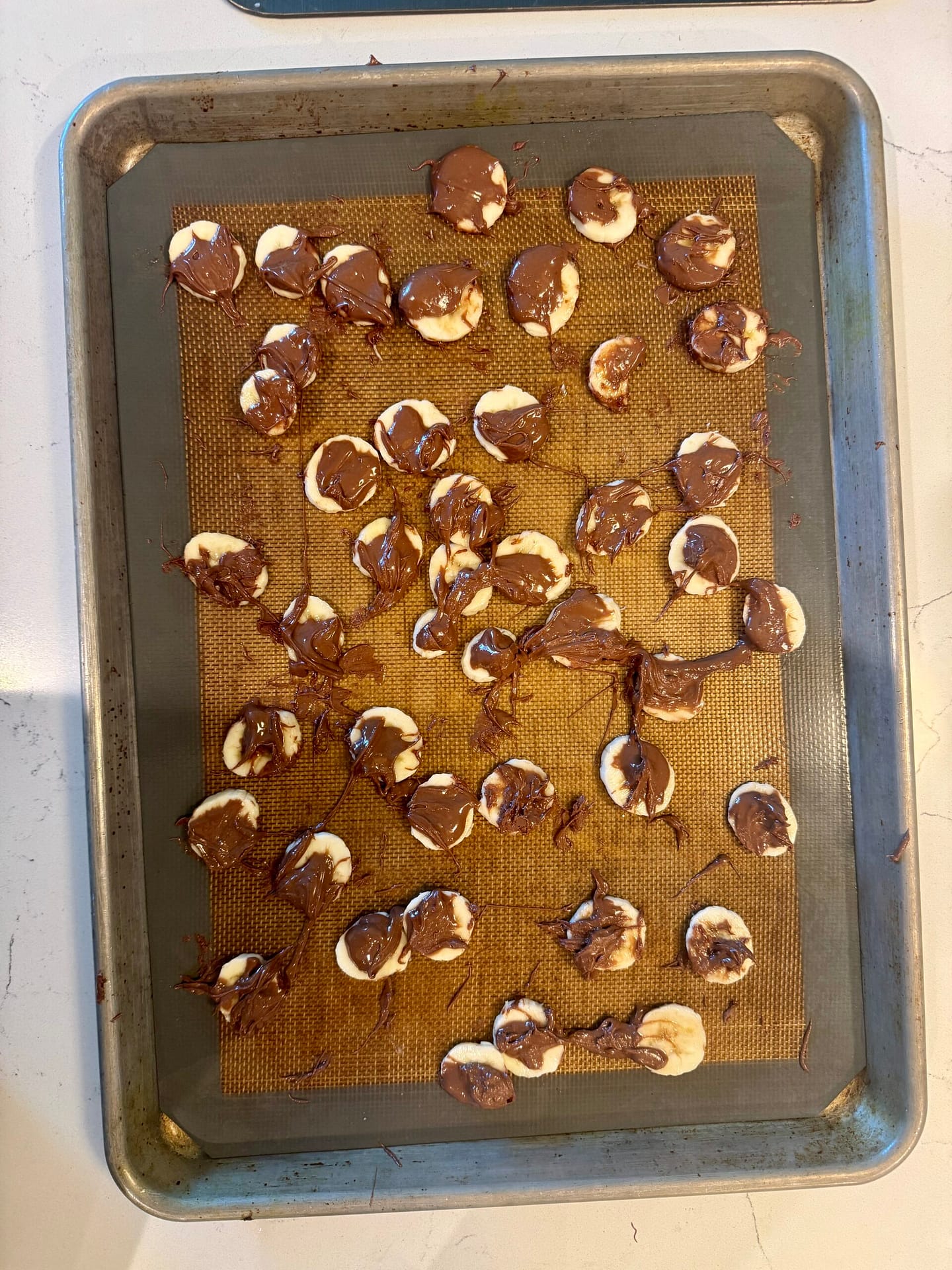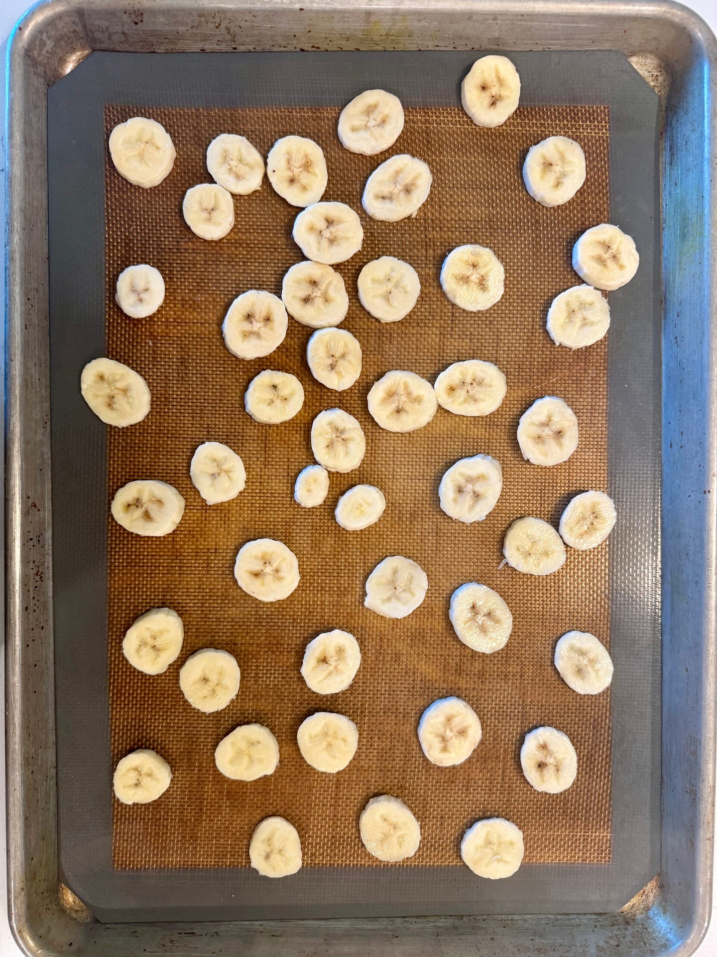 Spread sliced bananas on a sheet pan lined with silicone or parchment paper.
