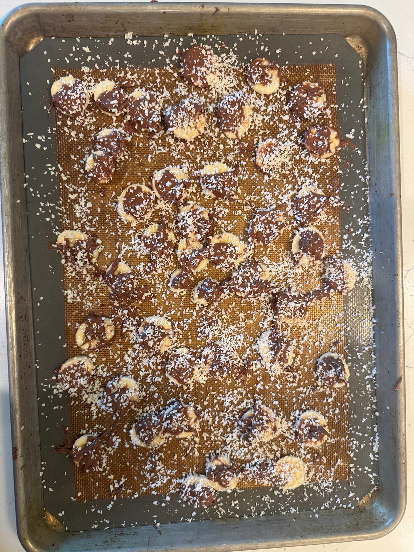 Sprinkle chocolate bananas with coconut flakes.