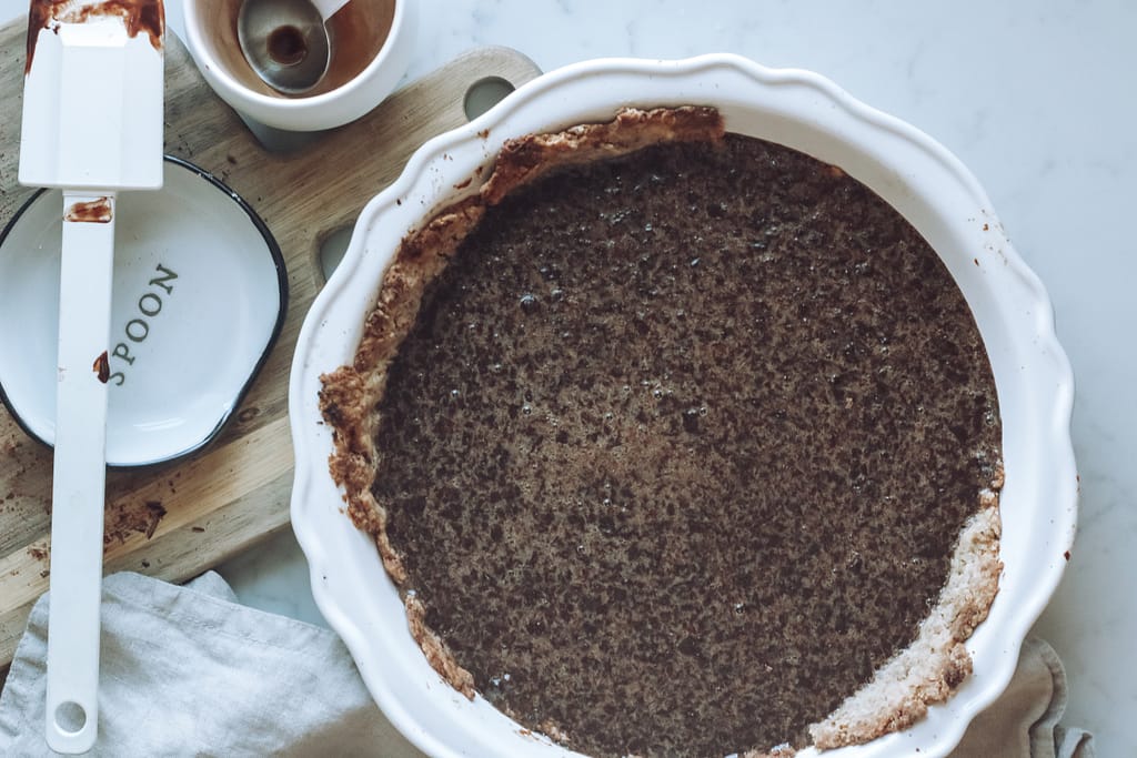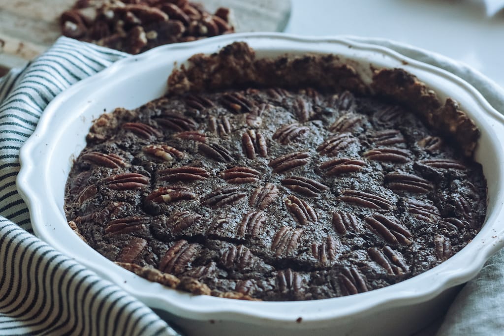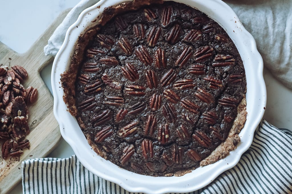 Actually, the ingredients in this pie are pure, simple and low-glycemic. You don’t have to feel guilty about this dessert on Thanksgiving day and your family won’t even know you used healthier ingredients! I chose ingredients that I feel comfortable feeding my family and children. Instead of high-glycemic, processed cane sugar, you will see coconut sugar and pure maple syrup. Raw cacao and grass-fed butter supply this pie with extra nutrients and the rustic, homemade crust will not disappoint. I hope you’ll give this pie a try at your upcoming Thanksgiving dinner, or anytime of the year!