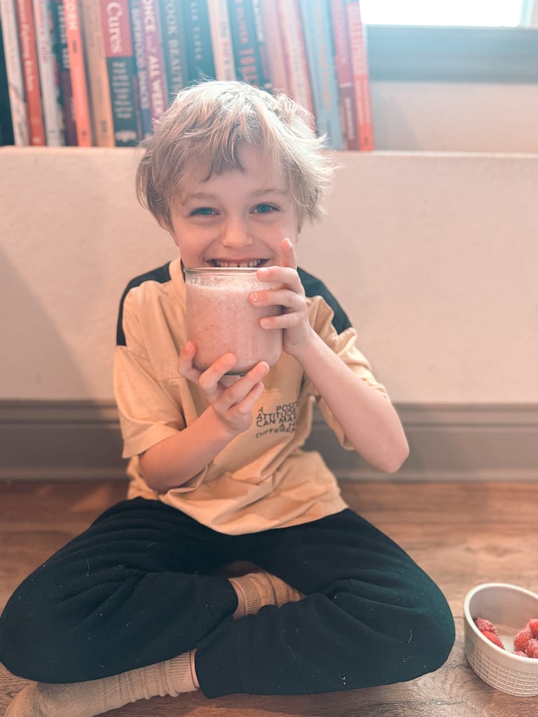 If you’re like me, you’re thinking of ways to sneak all the nutrients into your kids diet. Typically, smoothies are the easiest way to do the sneaking. All my kids want is a basic strawberry smoothie and I just want to sneak some extra nutrition in, so the kids and I found a smoothie we both approve of, this easy kids strawberry smoothie.