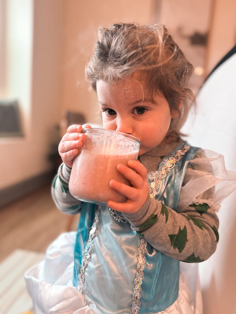 The ingredients are simple! A banana, some strawberries, kefir and filtered water. But wait, what did I sneak into this one? A liver capsule and some camu camu. They can’t taste the add in’s and it’s a win win!