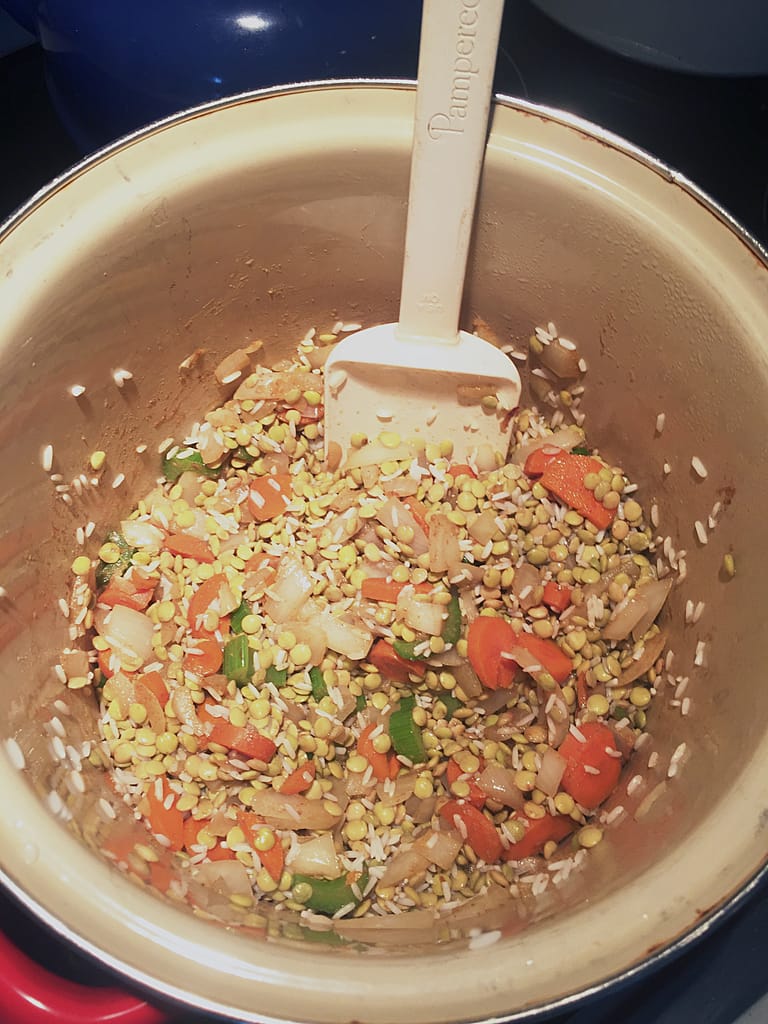 - Heat oil in a large pot over medium heat. Add onion, carrot and celery and cook until softened, about 5 minutes. Add spices, rice, and lentils and stir to combine. Add the water, salt and pepper and bring to a boil. Reduce heat to a low/simmer and continue to cook, loosely covered, until beans are tender, about 20 minutes.