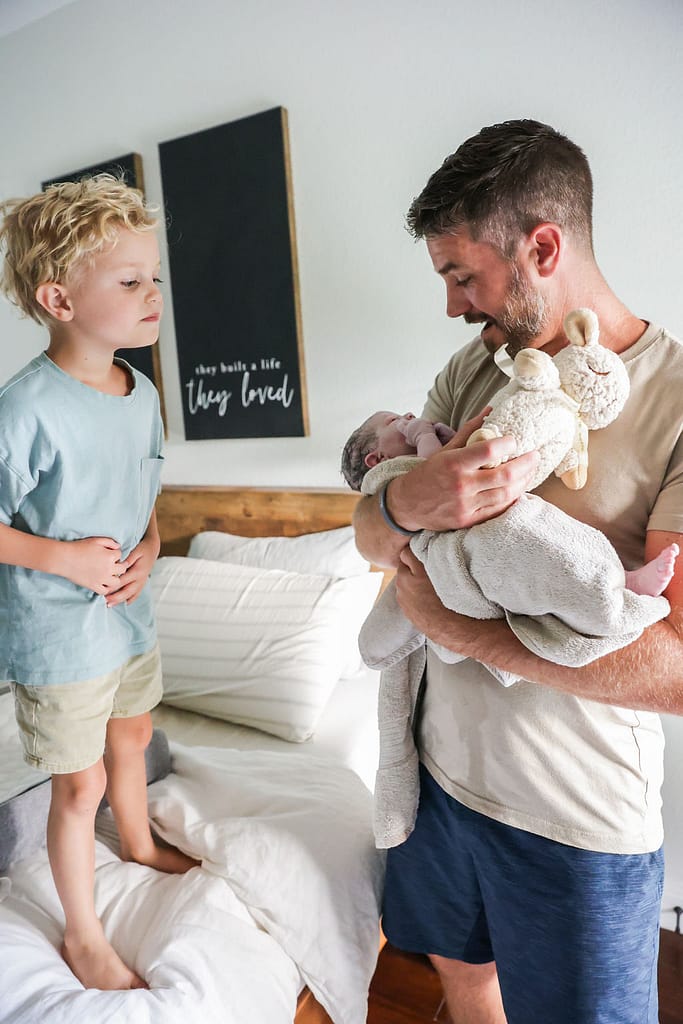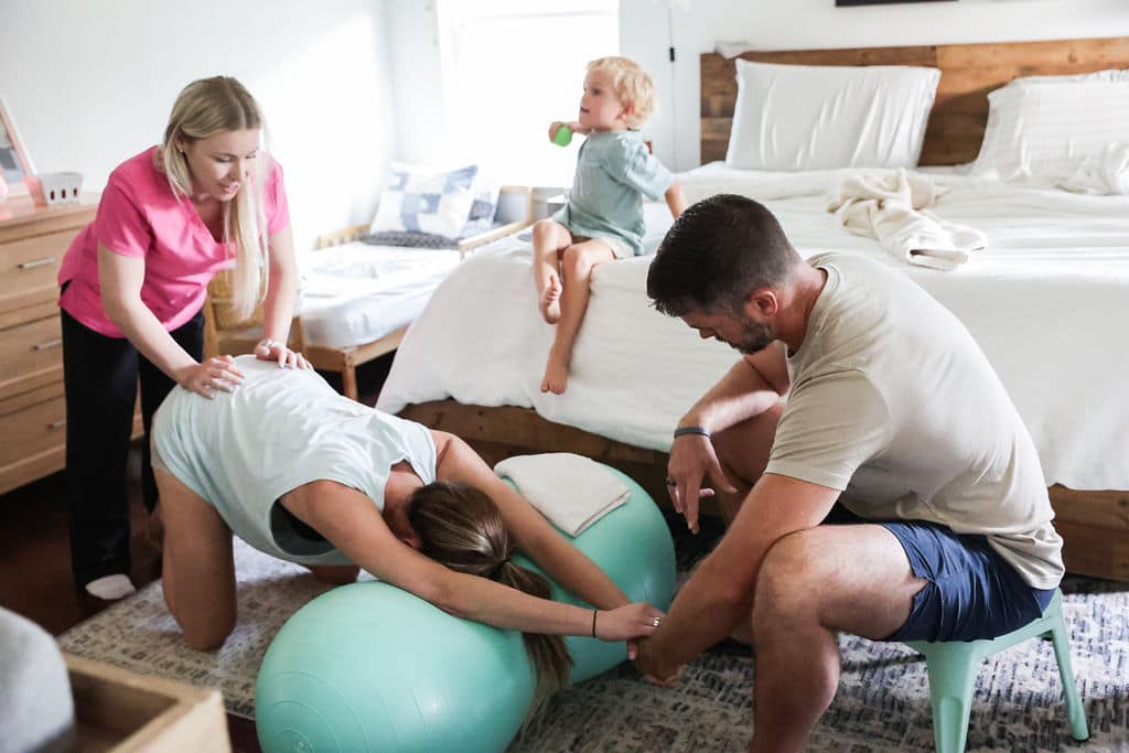 Having finished dinner, I felt accomplished. I could now go have a baby, haha. We went to the bedroom and I leaned over the peanut ball. Contractions were definitely feeling stronger. Courtney was so encouraging. She reminded me how to breathe, kept essential oils close and kept pushing on my lower back. Jordan held my hand through strong contractions. Lyndsay snapped photos and Asher sat on the bed asking non-stop questions. At one point, Jordan had to sit Asher outside the room, not because we didn’t want him a part of it all but because he was being so distracting. Asher sat in a chair by the door and said he was protecting (guarding) the room for baby Poppy. 🙂 My mother in law stayed upstairs with Judah most of the time because anytime he came in the room he just started running around and singing, or “screaming,” at the top of his lungs.