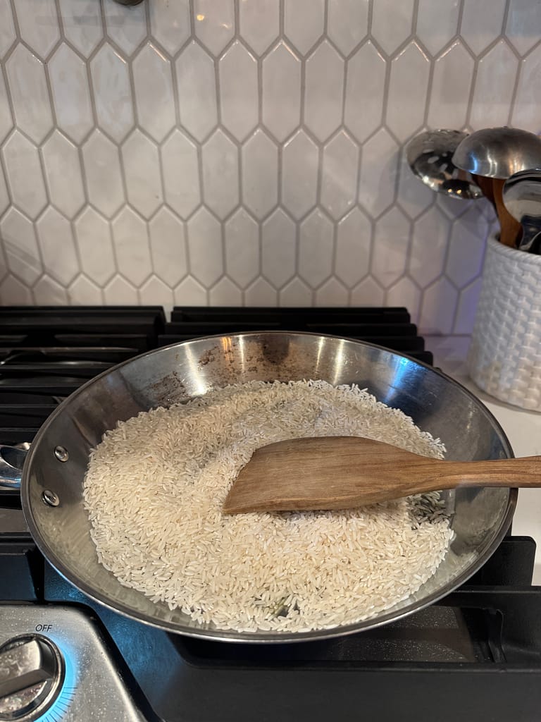 In a large skillet, add oil over medium heat; add rice and mix for about 5 minutes until slightly golden brown.