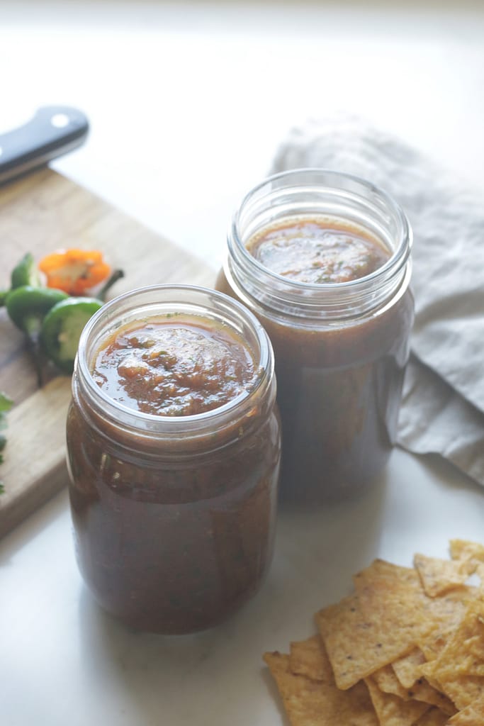 This salsa contains a blend of jalapenos, habanero, garlic, cilantro and tomatoes to give it the perfect spicy bite. Eat this salsa with tortilla chips which is my personal favorite way or add this salsa to tacos, eggs, or whatever your heart desires! This salsa is also delicious on these homemade breakfast tacos!